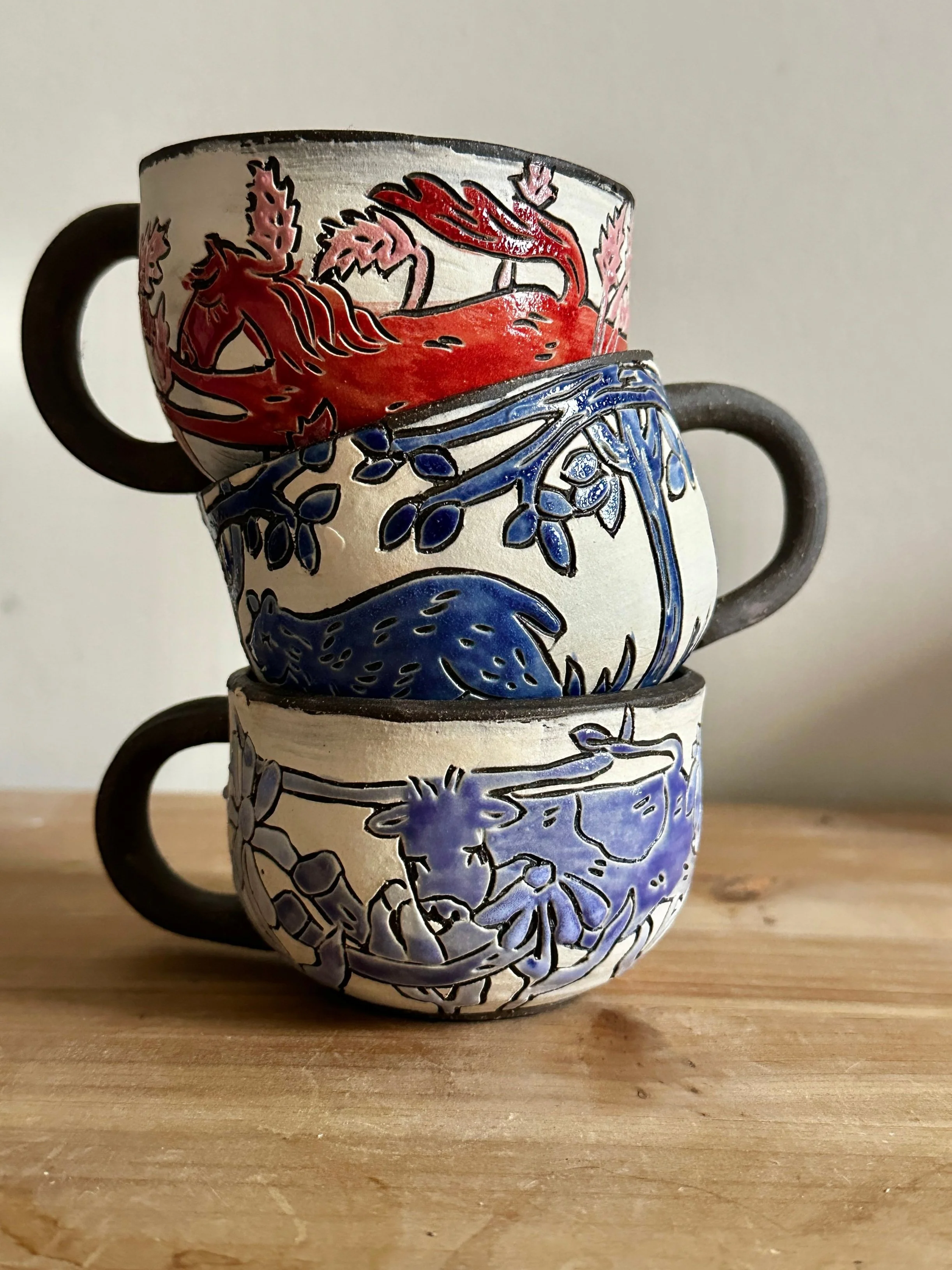 She fell in love with clay after taking a community art class downtown at the Visual Arts Center. Her work is mostly wheel thrown with a dark brown stoneware clay, and has hand drawn imagery created through sgraffito, inlay, and painted illustration.